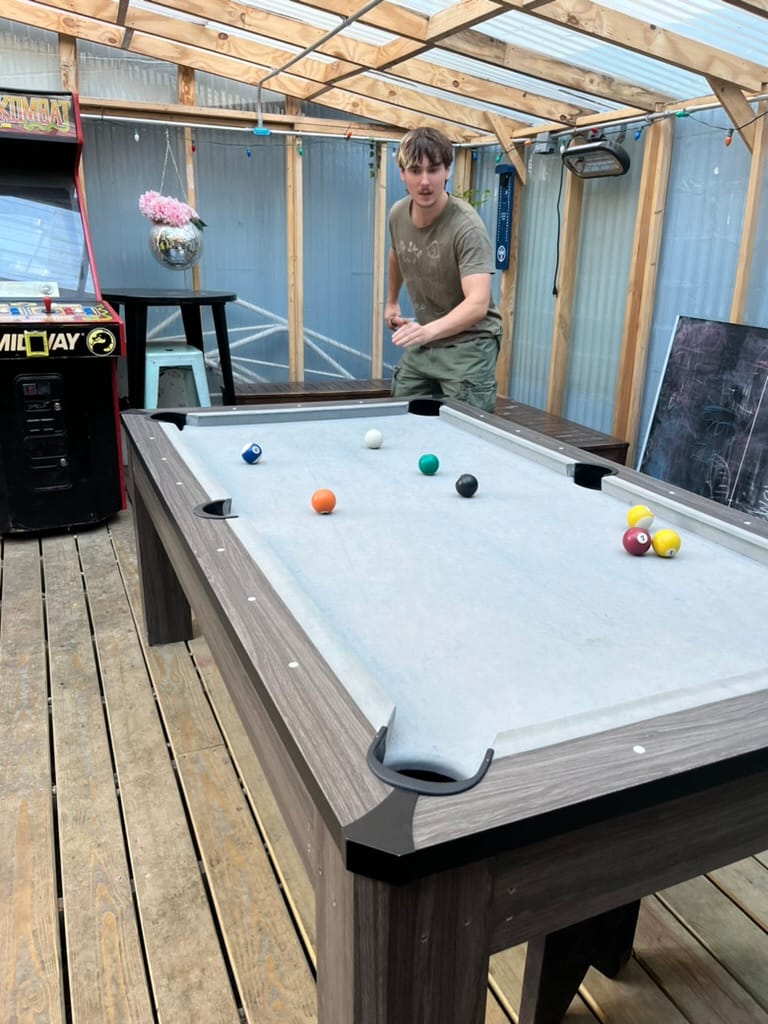 A bar I am particularly keen on, however, is banks bar, so named for being on the banks of the east river - which cuts between Manhattan and Brooklyn. Banks is on the brooklyn side, in greenpoint, wandering distance from Chez and Ivy's flat. I love it for a rather unique construction in its garden: a sort of plastic shed which houses a pool table. It is about half indoor, half outdoor, and lets in all the good elements (light, fresh air) and none of the bad ones (wind, rain, (snow?)). Tate – a close friend in these early new york days – and I are become very keen pool players.