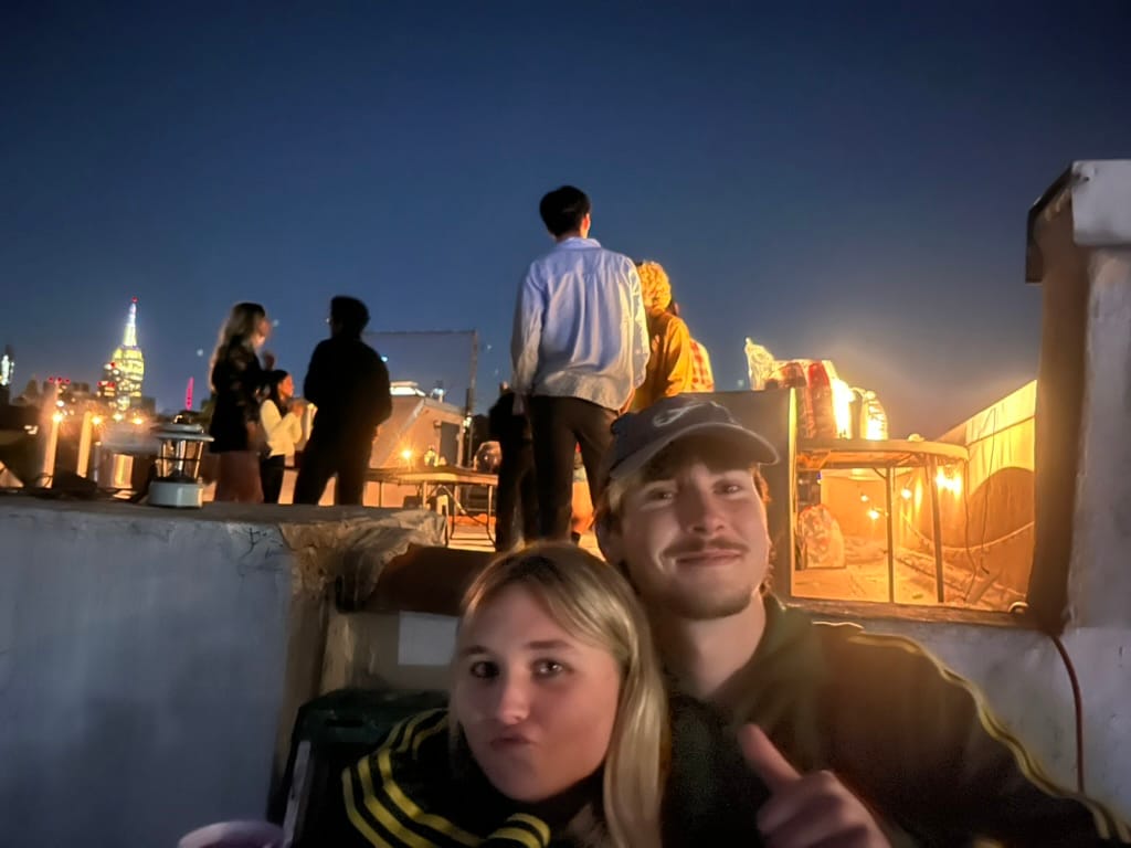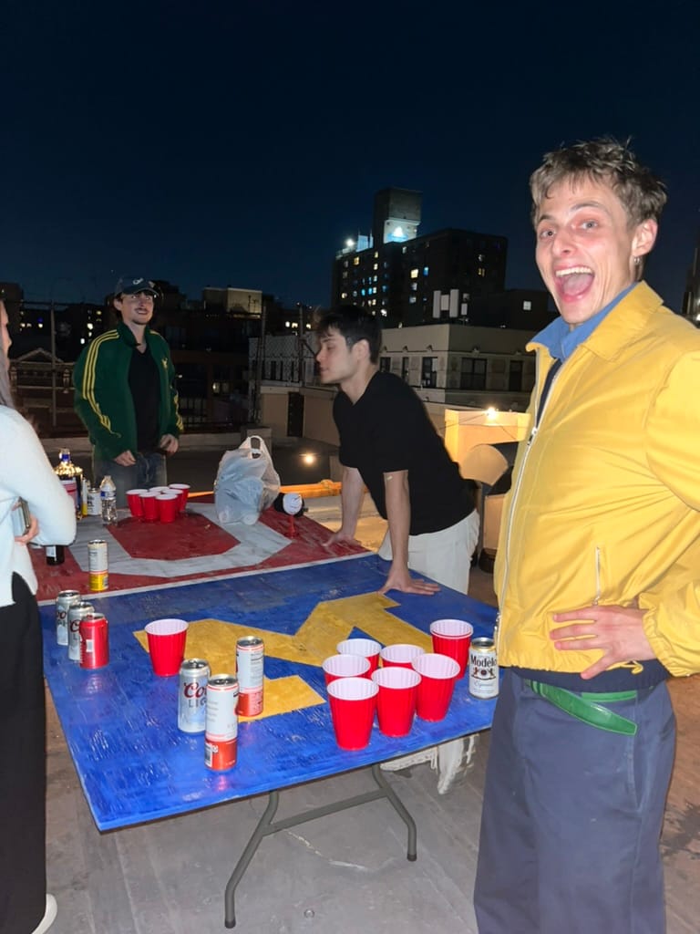 Beer pong on an east village roof (that tall bright thing is the empire state building!)